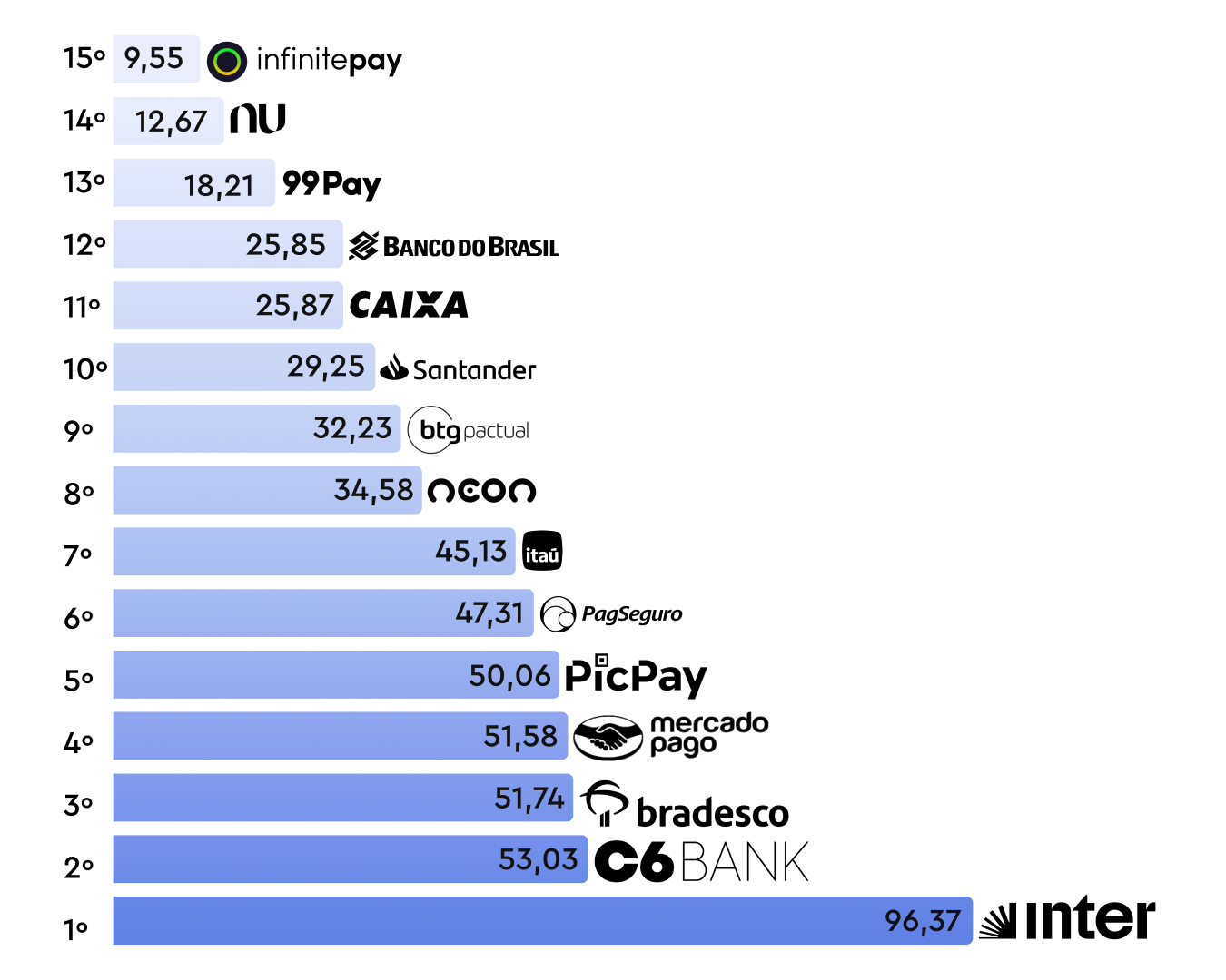 Com um número de contas abertas que mais que dobrou nos últimos 12 meses, chegando a um total de 14 milhões, a InfinitePay teve apenas 135 reclamações procedentes. Isso resultou em um índice de 9,55. O “Ranking de Reclamações” do BC leva em conta a estimativa de reclamações procedentes por milhão de clientes de cada instituição. Para efeito de comparação, por exemplo, os primeiros colocados do ranking apresentaram índices de reclamações 908%, 455% e 442% maiores do que o da InfinitePay.