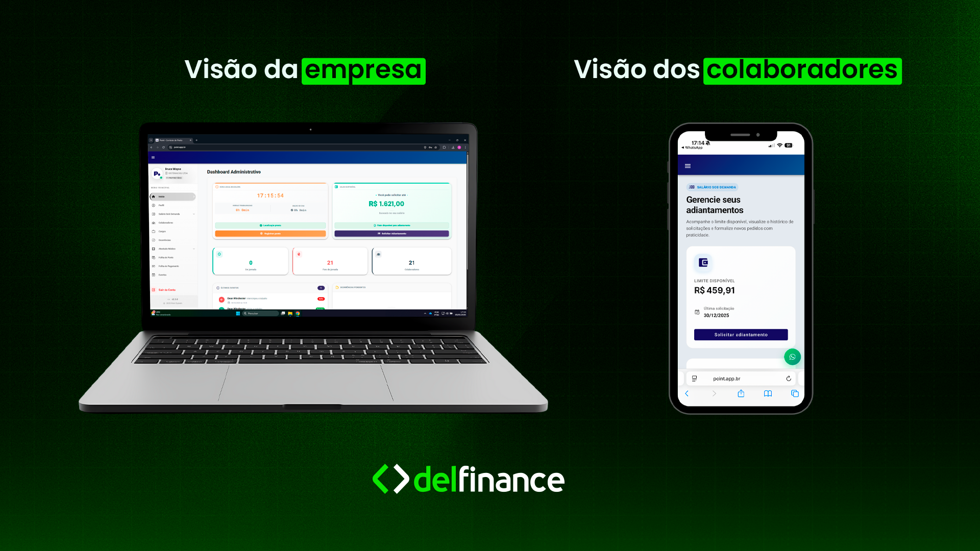 Desde o primeiro acesso, o Point foi pensado para facilitar. Ao realizar o login, o administrador encontra uma visão geral clara e objetiva, com informações essenciais do dia a dia, como a visualização dos colaboradores e cargos cadastrados, controle de horas, registro de ocorrências, eventos, atestados médicos, folha de ponto e de pagamento. Além do salário sob demanda, que pode ocorrer por meio da antecipação salarial (quando o recurso é da empresa) ou crédito consignado (quando o recurso é da Delfinance).