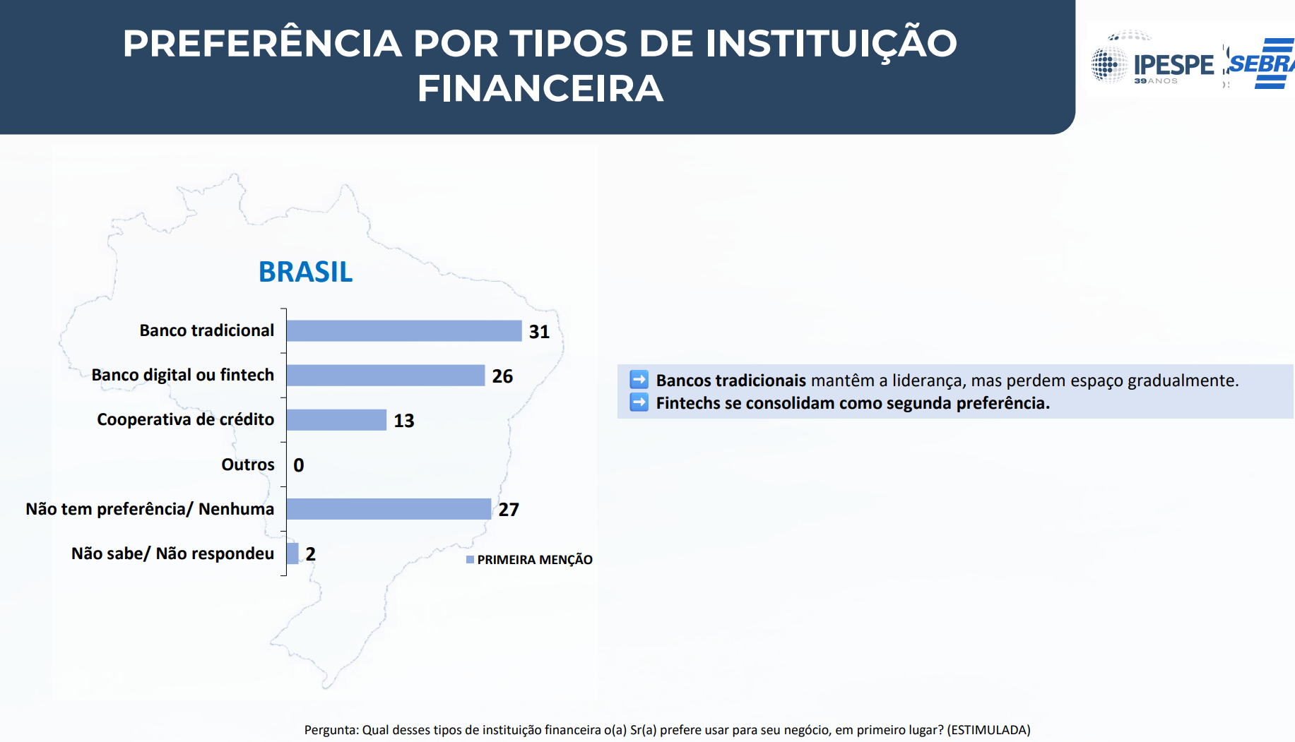 MEIs, no entanto, é a única categoria em que os bancos tradicionais perdem a liderança. Entre as microempresas e os negócios de pequeno porte, as fintechs e os bancos digitais figuram atrás das instituições tradicionais com 20% e 13% das preferências, respectivamente.
