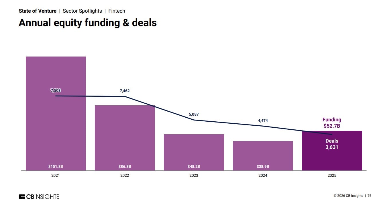 O mercado global de fintechs voltou a ganhar fôlego em 2025, segundo o estudo “State of Venture”, da CB Insights, divulgado na quinta-feira (8/1). Após dois anos de queda, o volume anual de investimentos de equity nessas empresas chegou a US$ 52,7 bilhões em 2025, alta de 35,4% na comparação com o ano anterior. Já o número de rodadas seguiu em retração, com 3.631 deals no ano passado, contra 4.474 em 2024 [veja gráfico abaixo]. A combinação mostra um mercado mais seletivo, com menos operações e aportes maiores, distante do pico de 2021, quando o setor somou mais de US$ 150 bilhões em aportes.