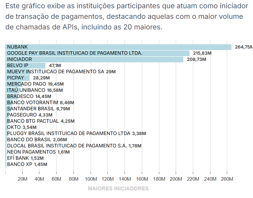 Conforme dados disponíveis no Dashboard do Cidadão, no site do Open Finance Brasil, de outubro a dezembro de 2025, os maiores ITPs foram três fintechs: Iniciador, Google Pay e Nubank. Significa, então, que as instituições tiveram o maior volume de chamadas de APIs nesse período.