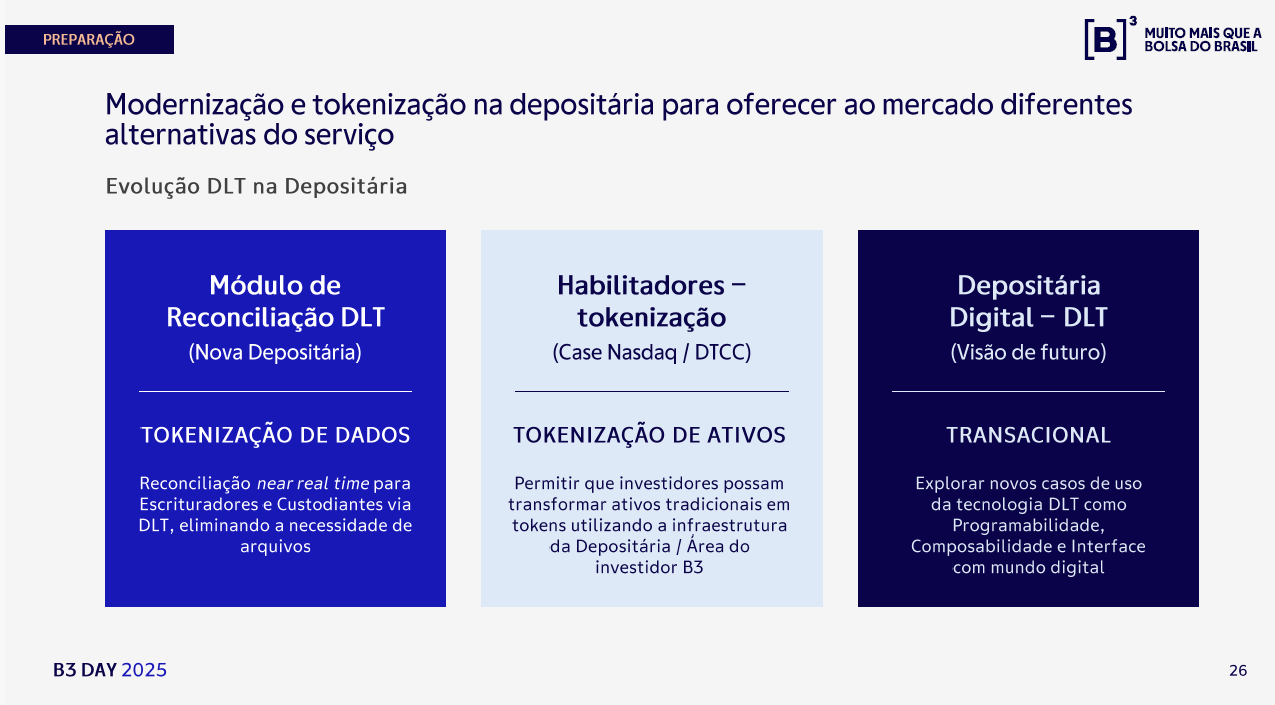 A B3 está estudando novas tecnologias como tokenização e stablecoins para ampliar seu portfólio de produtos. A informação foi divulgada pela companhia durante o B3 Day, evento realizado nesta terça-feira (16/12) para investidores. A iniciativa faz parte da estratégia de diversificação de receitas da dona da bolsa de valores brasileira.